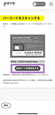 ●「SIMカードを有効化」→バーコードをスキャン(台紙のバーコード)
