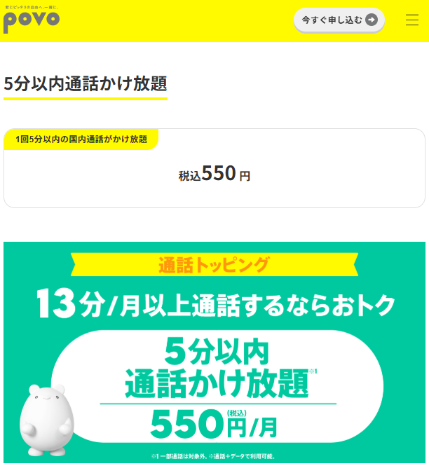 通話かけ放題:月1,650円(長電話が多いならこちら) povo2.0