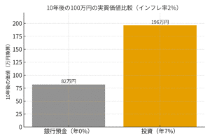 つまり、100万円を銀行に眠らせておくと、1年後には実質97〜98万円分の価値しかないということです。